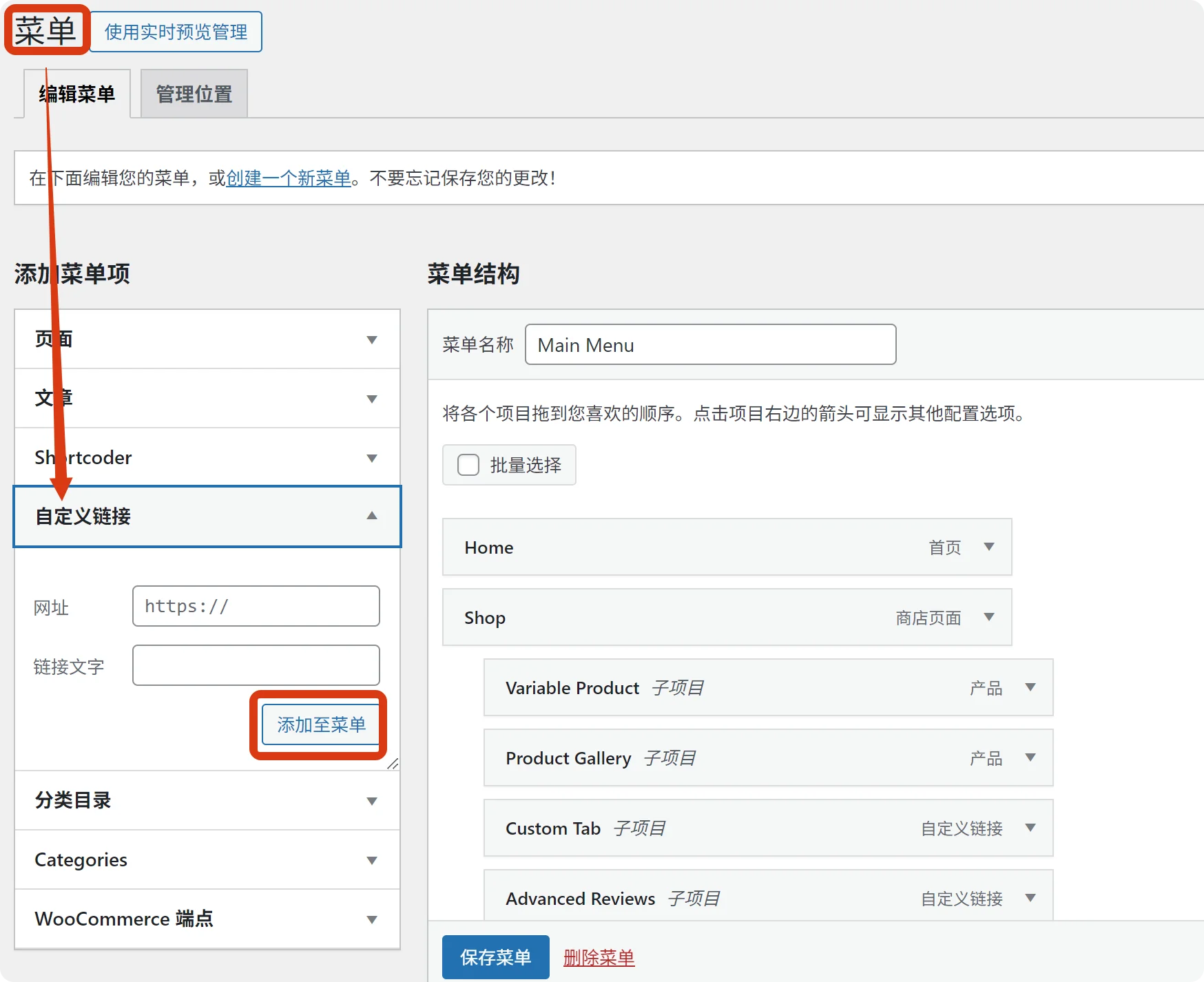 菜单选项——选择你要修改的菜单——自定义链接添加到菜单上